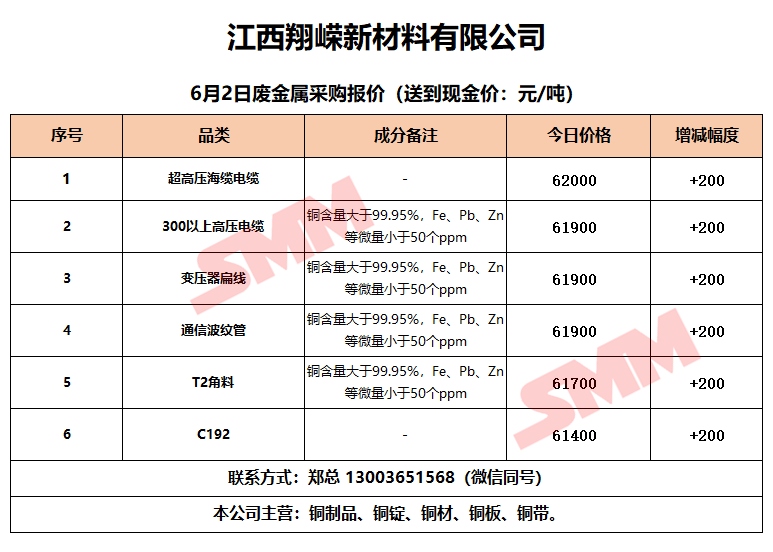 6月2日江西翔嵘新材料 废铜采购报价