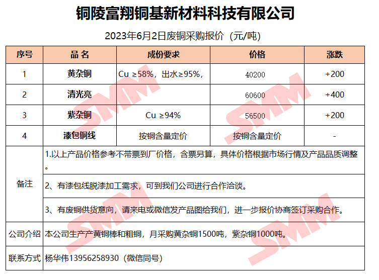 6月2日铜陵富翔 废铜采购报价