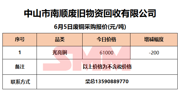 6月5日中山南顺 废铜采购报价