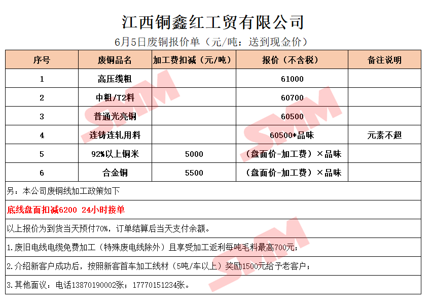 6月5日江西铜鑫红 废铜采购报价
