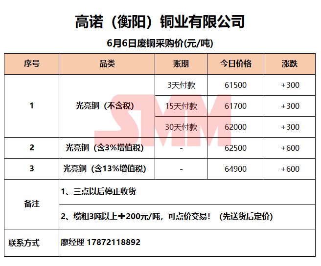 6月6日高诺(衡阳)铜业 废铜采购报价