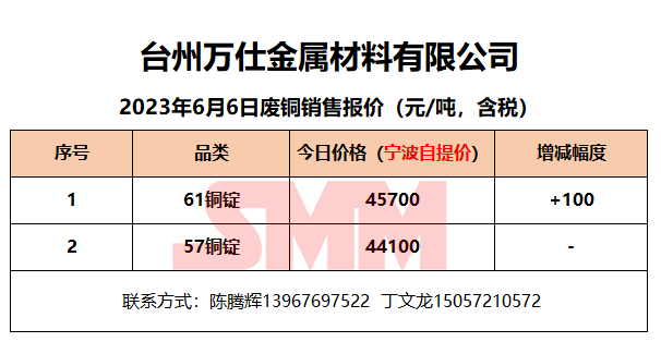6月6日台州万仕金属 废铜销售报价