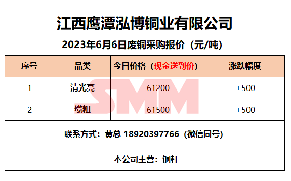 6月6日江西鹰潭泓博铜业 废铜采购报价