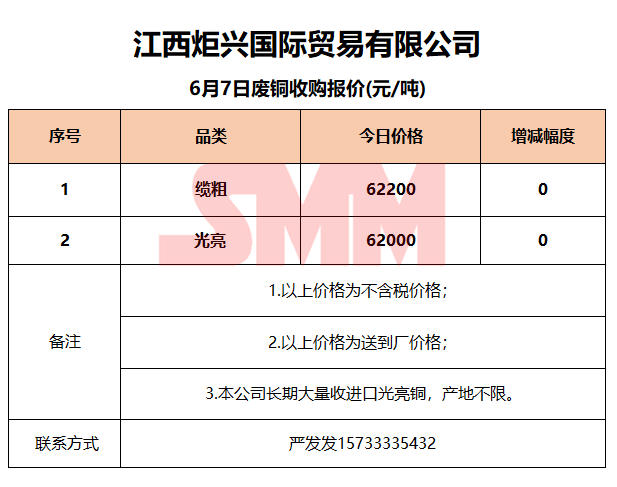 6月7日江西炬兴 废铜收购报价
