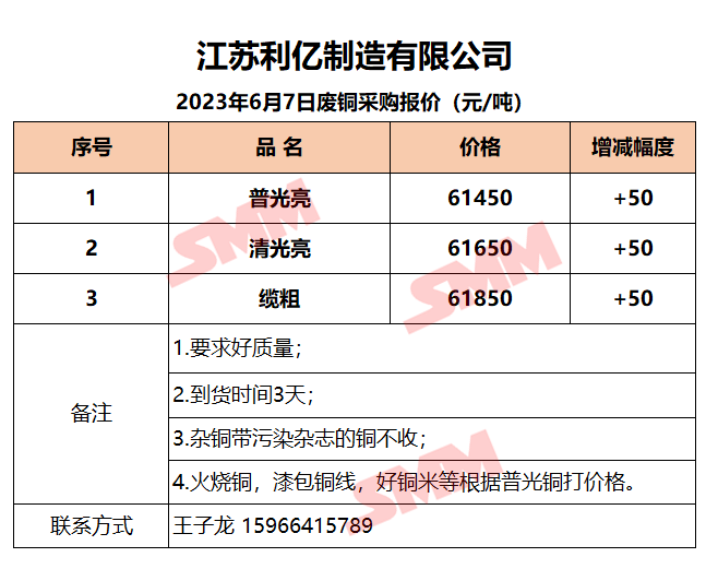 6月7日江苏利亿 废铜采购报价