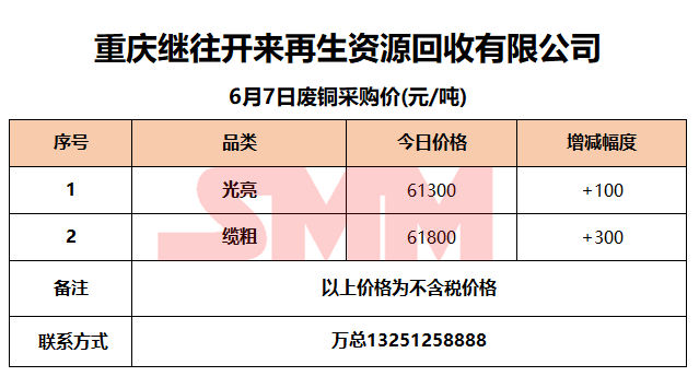 6月7日重庆继往开来 废铜采购报价
