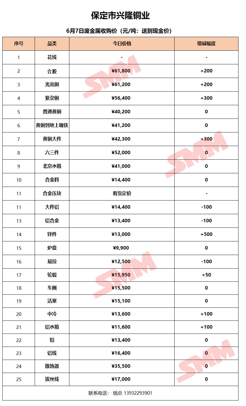 6月7日保定兴隆铜业 废金属收购报价