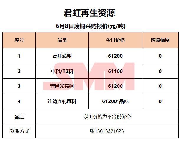 6月8日君虹再生资源 废铜收购报价