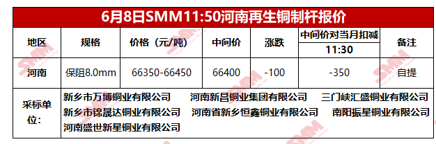 6月8日SMM河南地区再生铜制杆报价