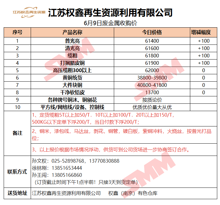 今日江苏权鑫再生资源利用有限公司 废金属收购报价已更新,有货的朋友欢迎联系我们!