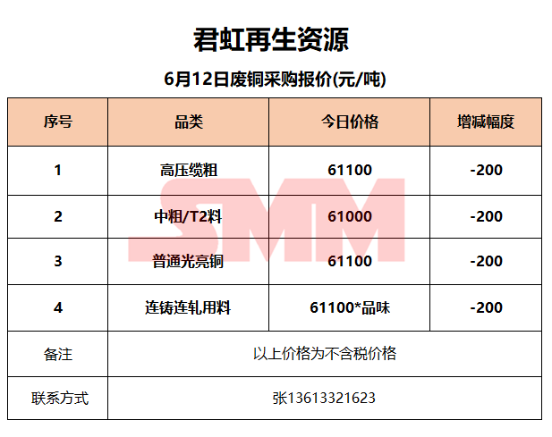 6月12日君虹再生资源 废铜收购报价