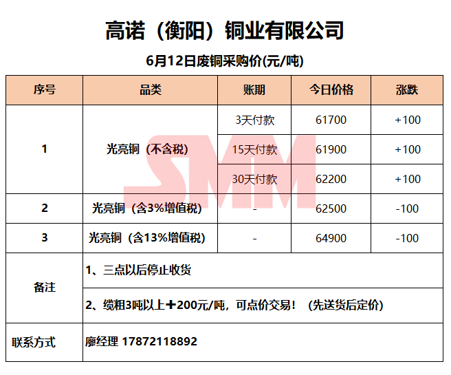 6月12日高诺(衡阳)铜业 废铜采购报价