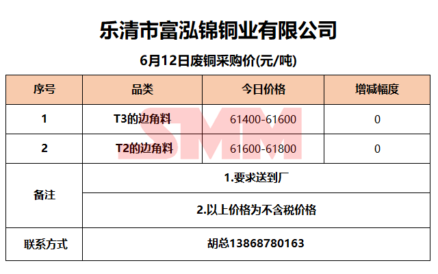 6月12日乐清富泓锦 废铜采购报价