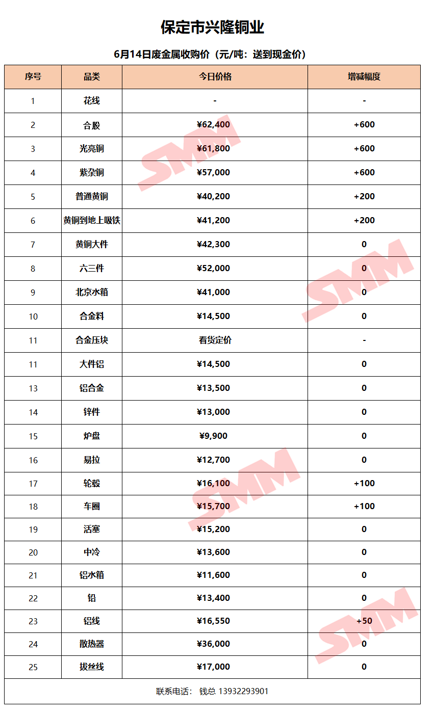 6月14日保定兴隆铜业 废金属收购报价