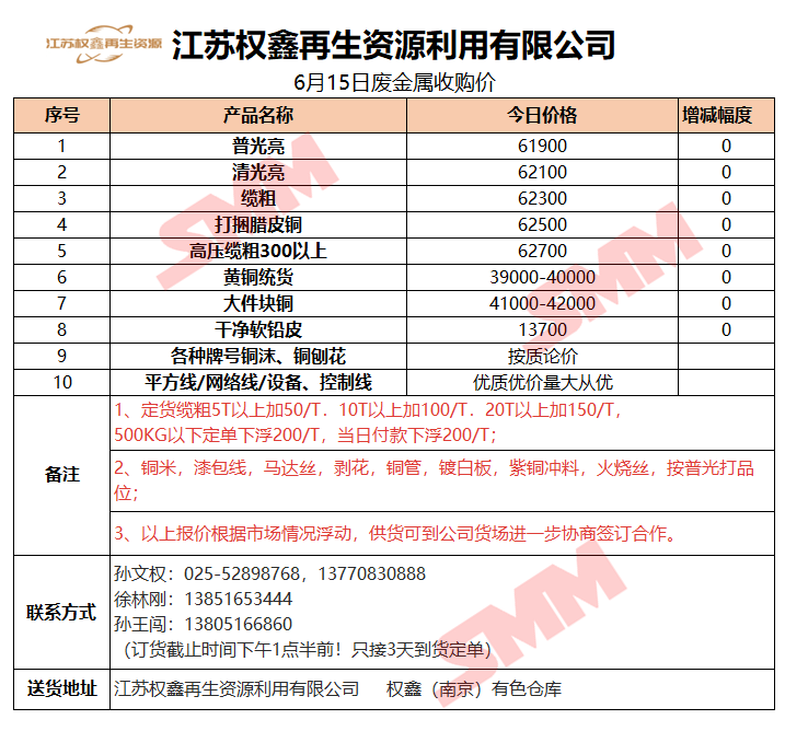 今日江苏权鑫再生资源利用有限公司 废金属收购报价已更新,有货的朋友欢迎联系我们!
