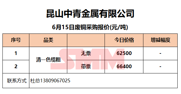 6月15日昆山中青 废铜采购报价