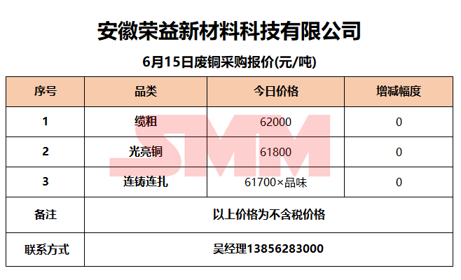 6月15日安徽荣益 废铜采购报价