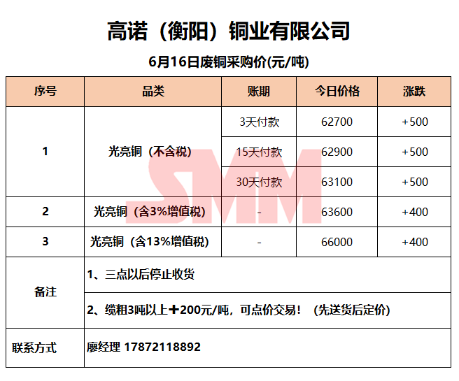 6月16日高诺(衡阳)铜业 废铜采购报价