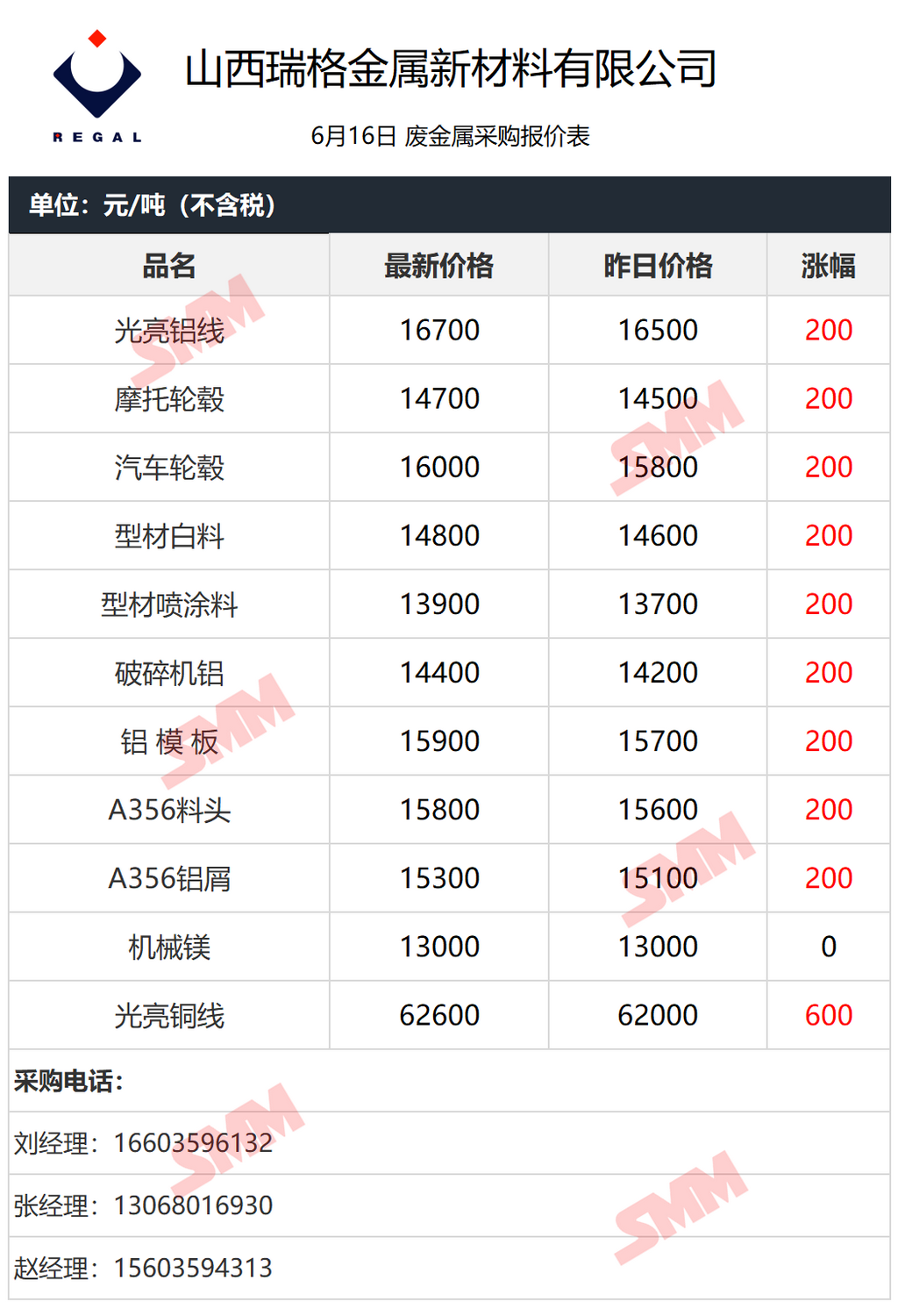 6月16日瑞格金属 废金属采购报价