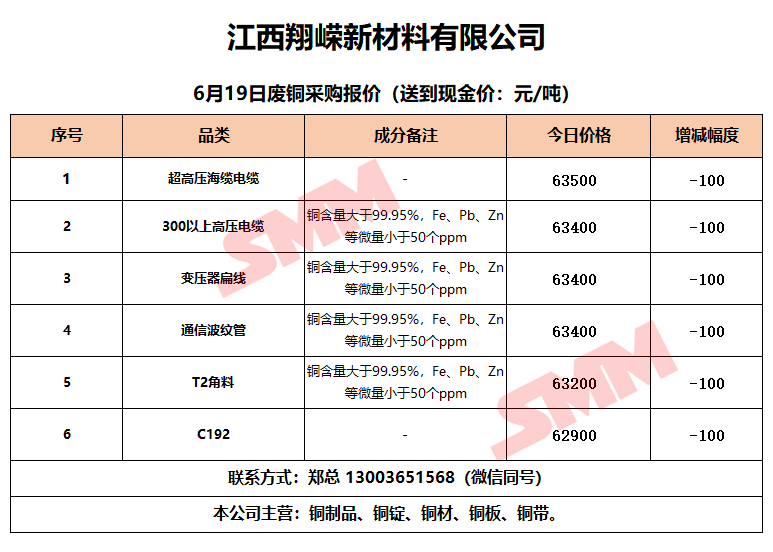 6月19日江西翔嵘新材料 废铜采购报价