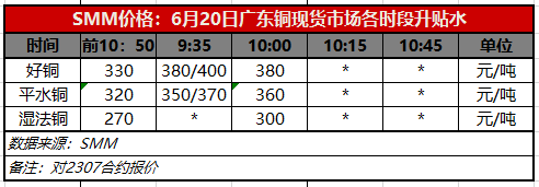 6月20日广东铜现货市场各时段升贴水(第二时段10:00)【SMM价格】
