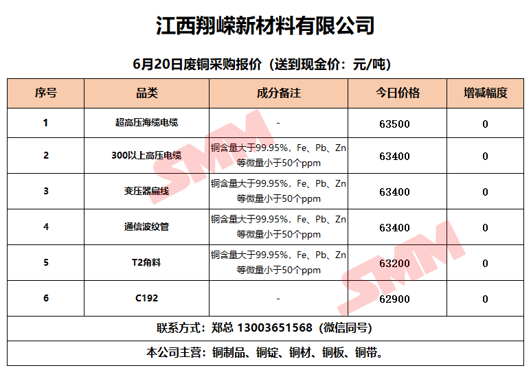 6月20日江西翔嵘新材料 废铜采购报价