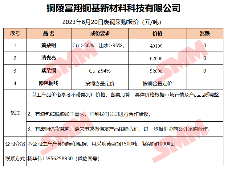 6月20日铜陵富翔 废铜采购报价