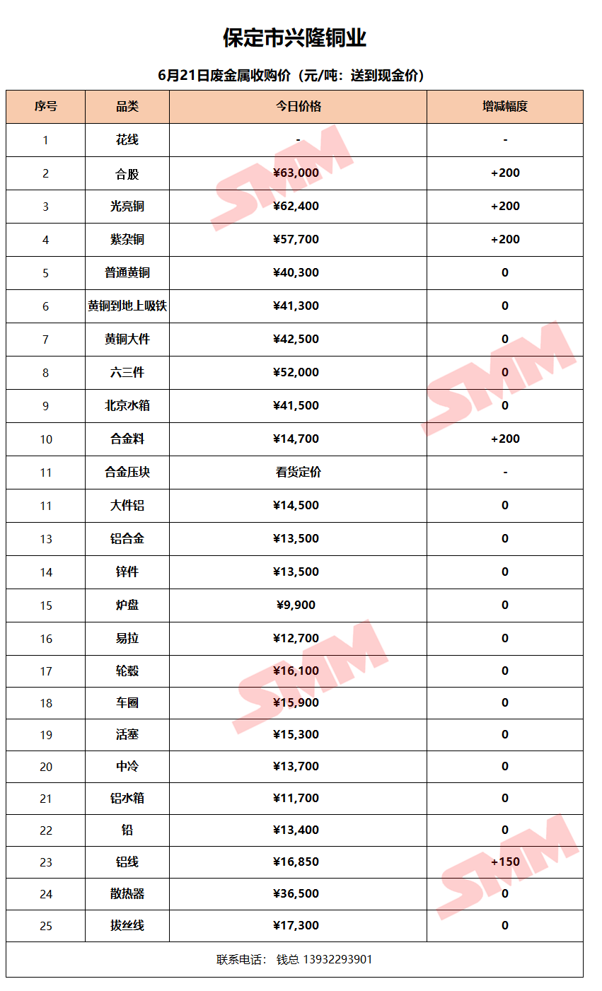 6月21日保定兴隆铜业 废金属收购报价