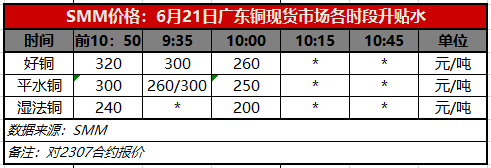 6月21日广东铜现货市场各时段升贴水(第二时段10:00)【SMM价格】