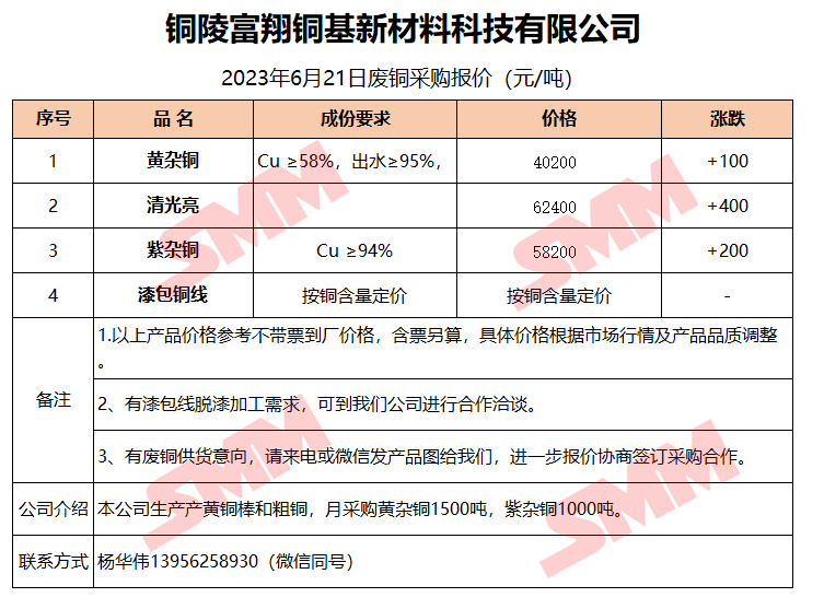 6月21日铜陵富翔 废铜采购报价