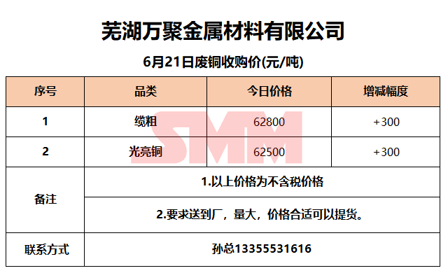 6月21日芜湖万聚金属 废铜收购报价