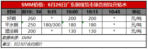 6月26日广东铜现货市场各时段升贴水(第三时段10:15)【SMM价格】