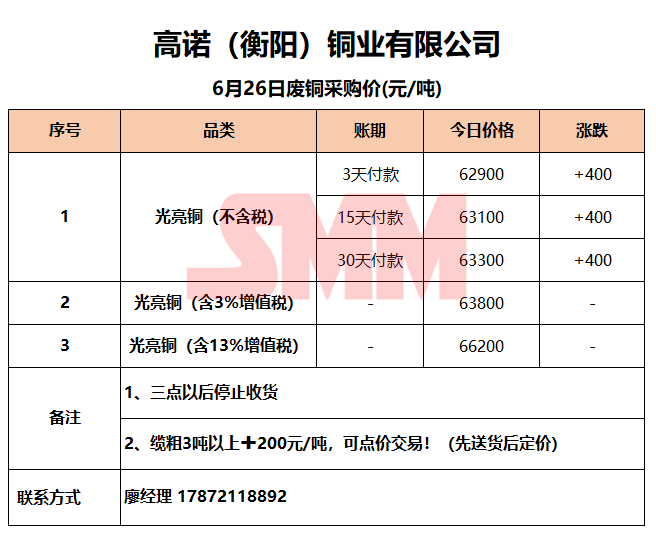 6月26日高诺(衡阳)铜业 废铜采购报价