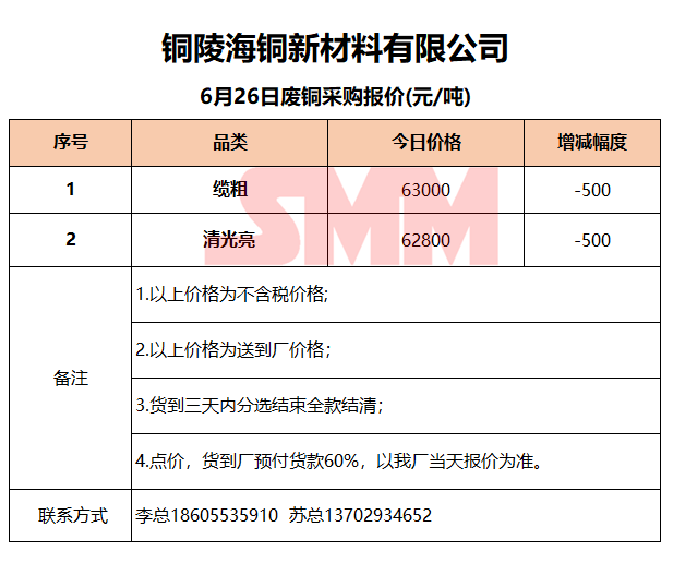 6月26日铜陵海铜 废铜采购报价
