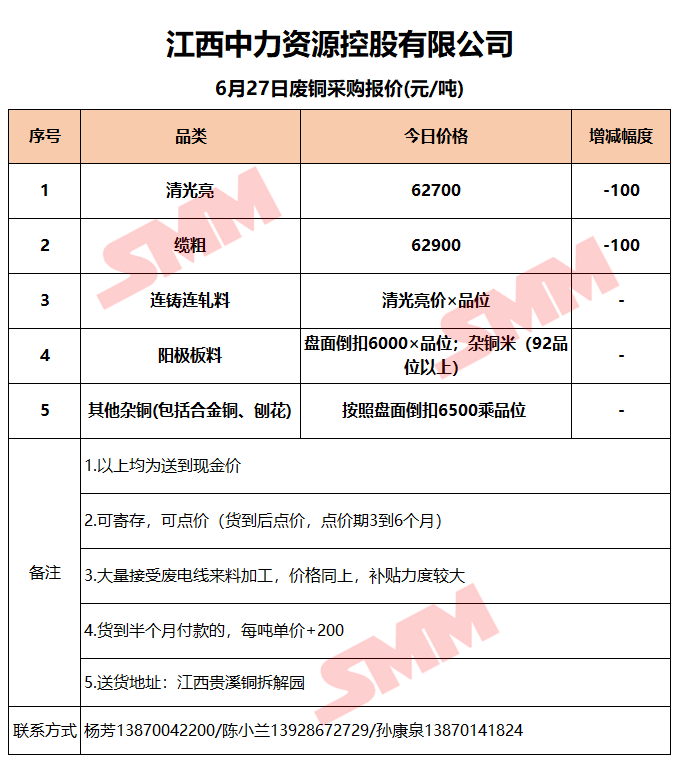 6月27日江西中力 废铜采购报价