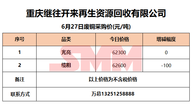 6月27日重庆继往开来 废铜采购报价