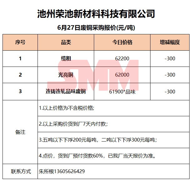 6月27日池州荣池 废铜采购报价
