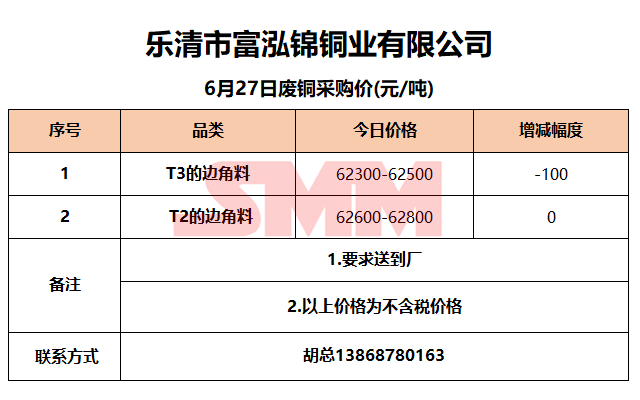 6月27日乐清富泓锦 废铜采购报价