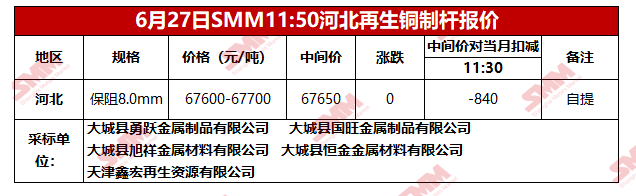 6月27日SMM河北地区再生铜制杆报价