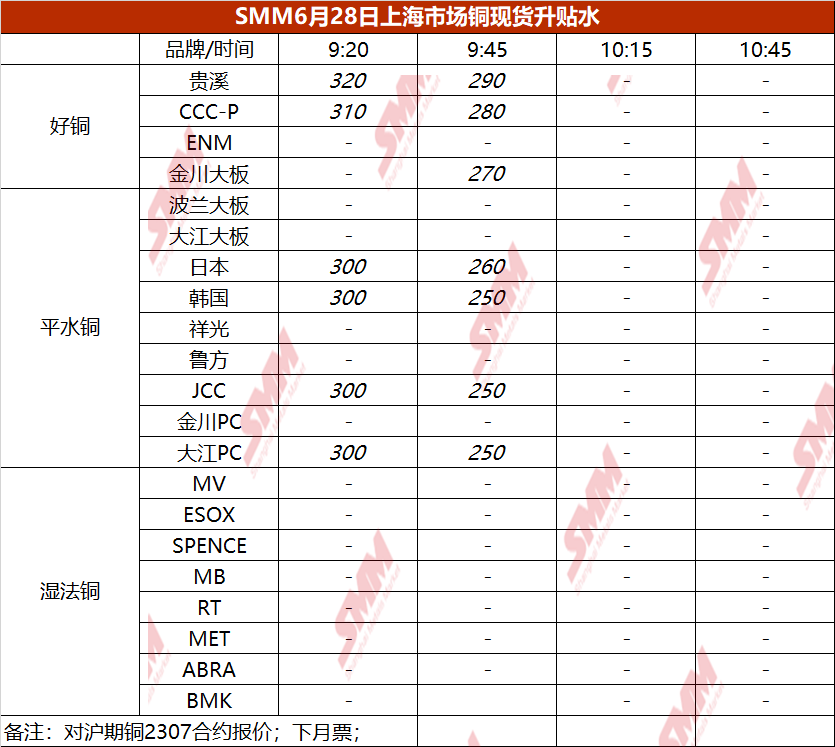 6月28日上海市场铜现货升贴水(第二时段)【SMM价格】