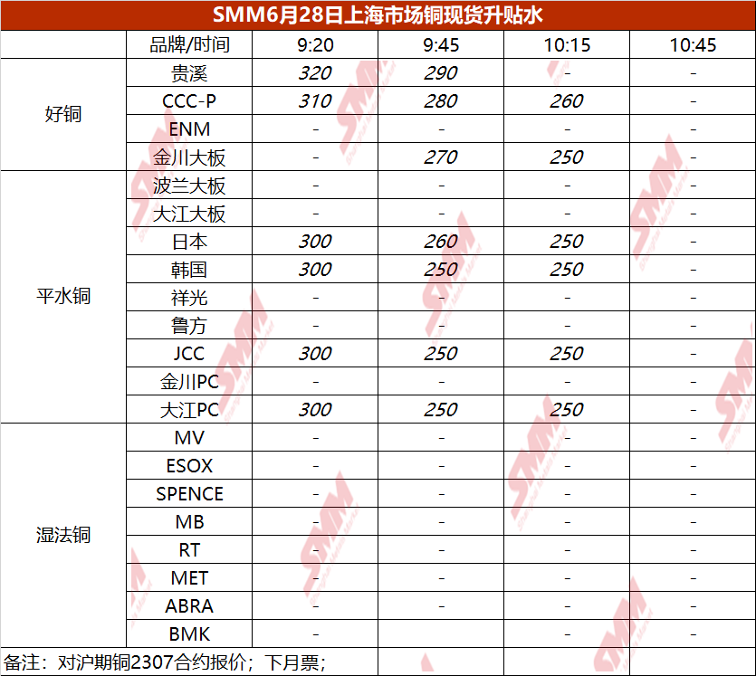 6月28日上海市场铜现货升贴水(第三时段)【SMM价格】