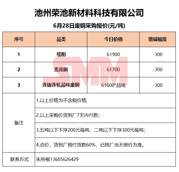 6月28日池州荣池 废铜采购报价