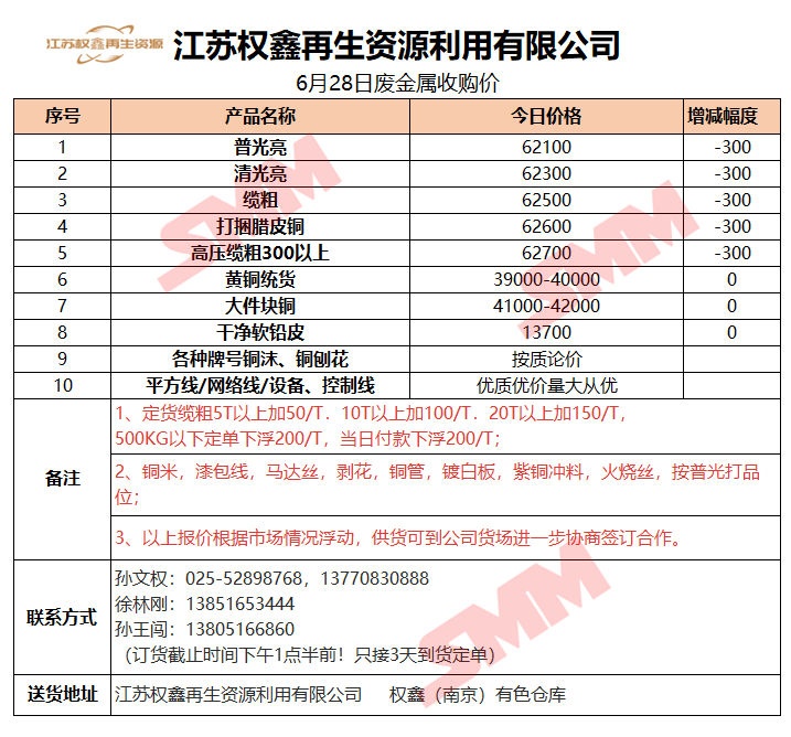 6月28日江苏权鑫 废金属收购报价