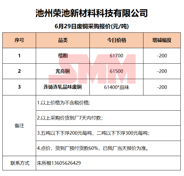 6月29日池州荣池 废铜采购报价