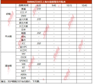 6月30日上海市场铜现货升贴水(第一时段)【SMM价格】