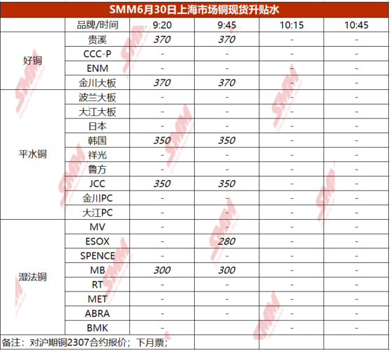 6月30日上海市场铜现货升贴水(第二时段)【SMM价格】