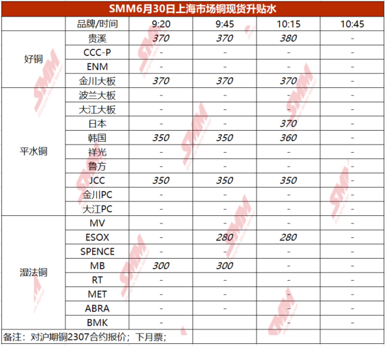 6月30日上海市场铜现货升贴水(第三时段)【SMM价格】