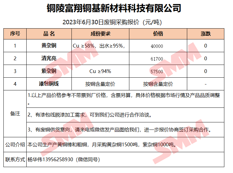 6月30日铜陵富翔 废铜采购报价
