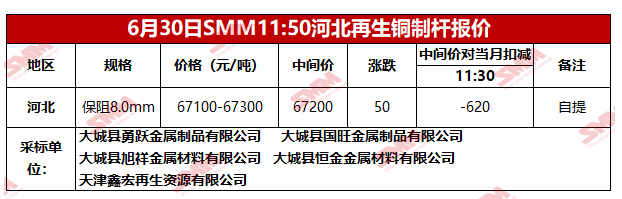 6月30日SMM河北地区再生铜制杆报价