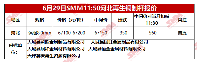 6月29日SMM河北地区再生铜制杆报价